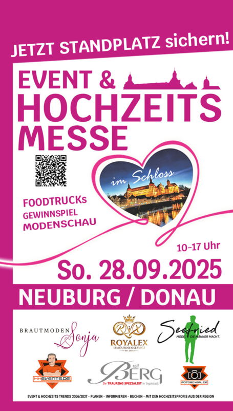 Die Messe findet in der atemberaubenden Kulisse des Schlosses Neuburg an der Donau statt – einer der romantischsten und geschichtsträchtigsten Locations Bayerns. Das Schloss verleiht jeder Veranstaltung ein märchenhaftes, verspieltes und exklusives Flair, das Besucher sofort in seinen Bann zieht.